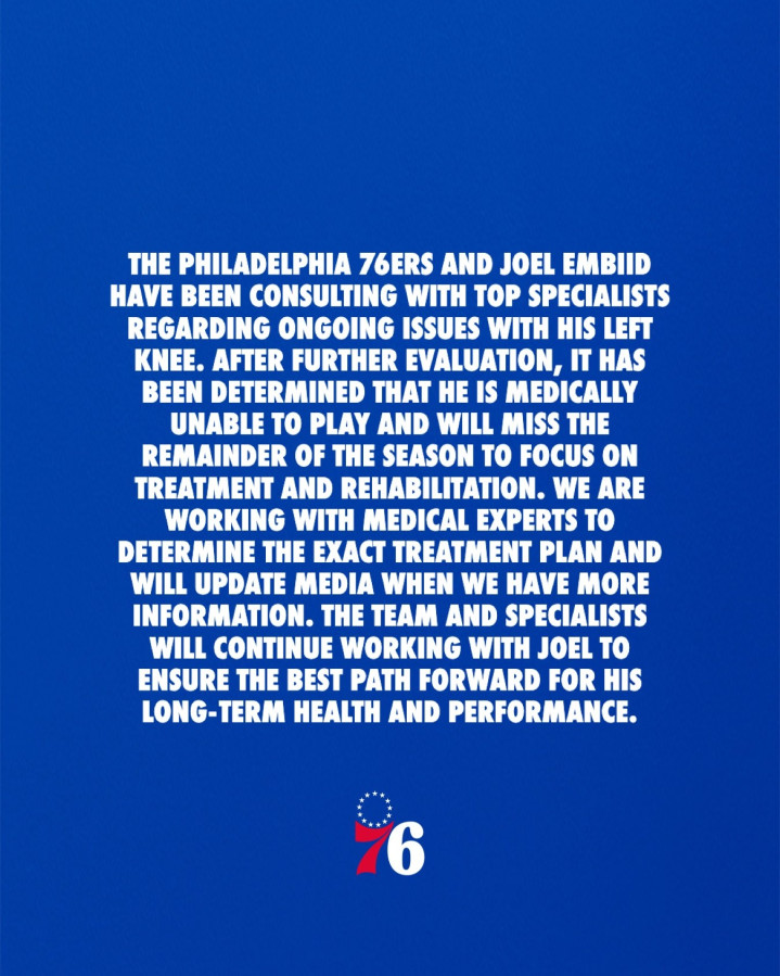 已就恩比德左膝的持续问题咨询了顶尖医疗专家。经过进一步评估,确认他因医疗原因无法继续参赛,将缺席本赛季剩余的所有比赛,以专注于治疗和康复。